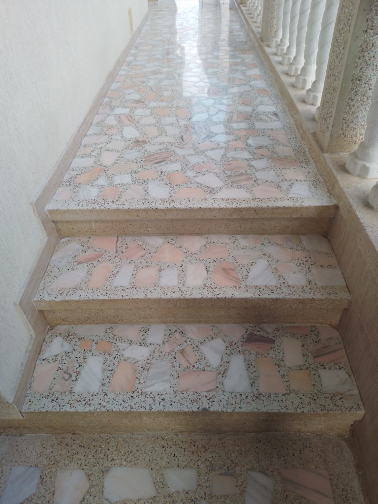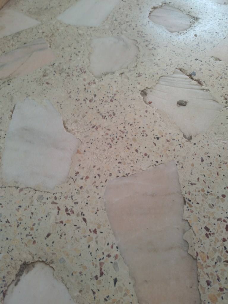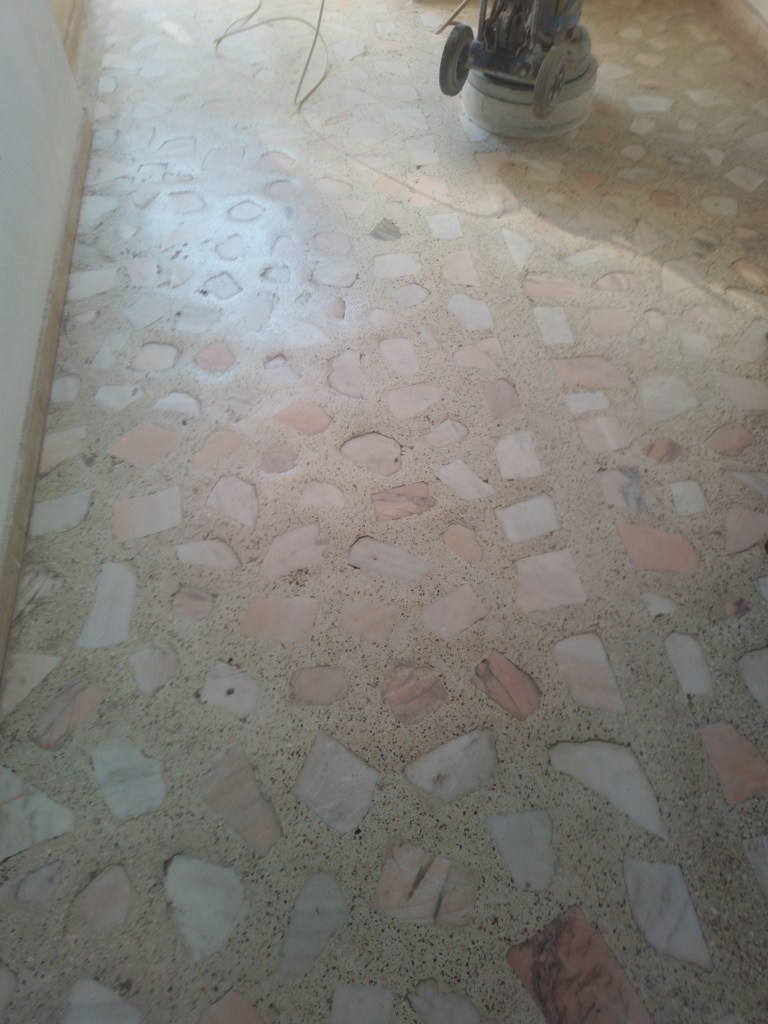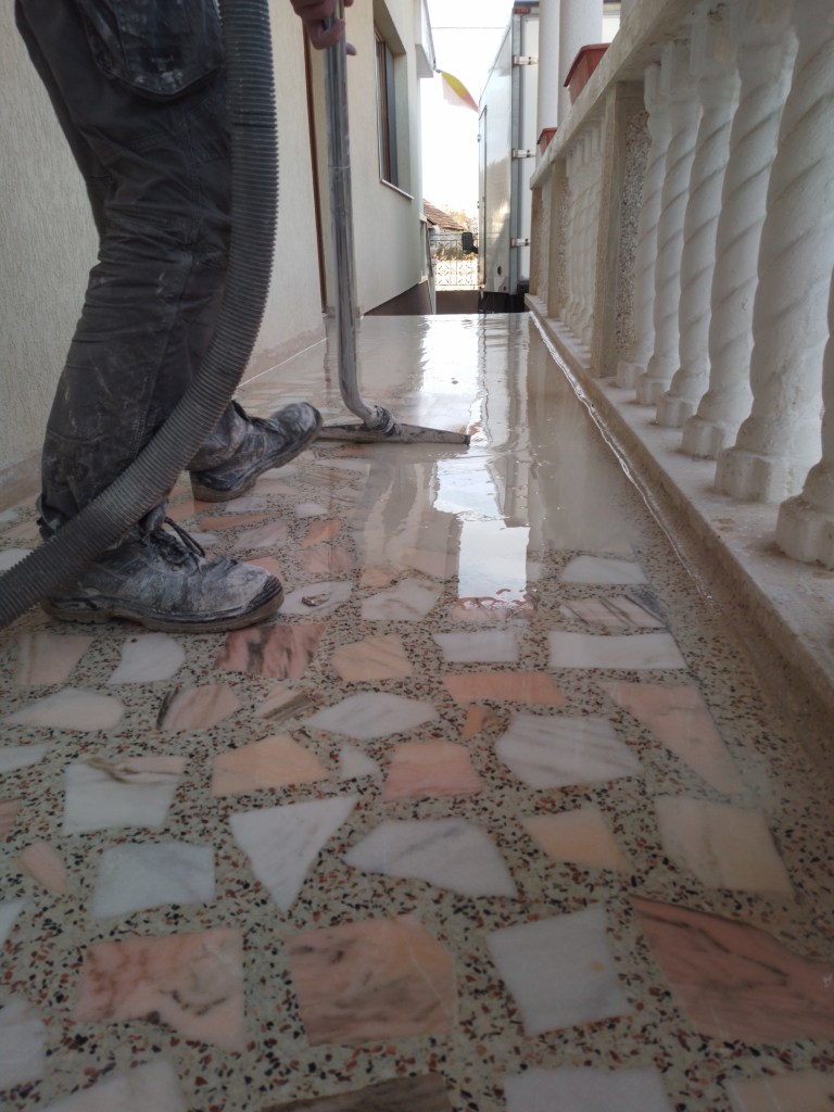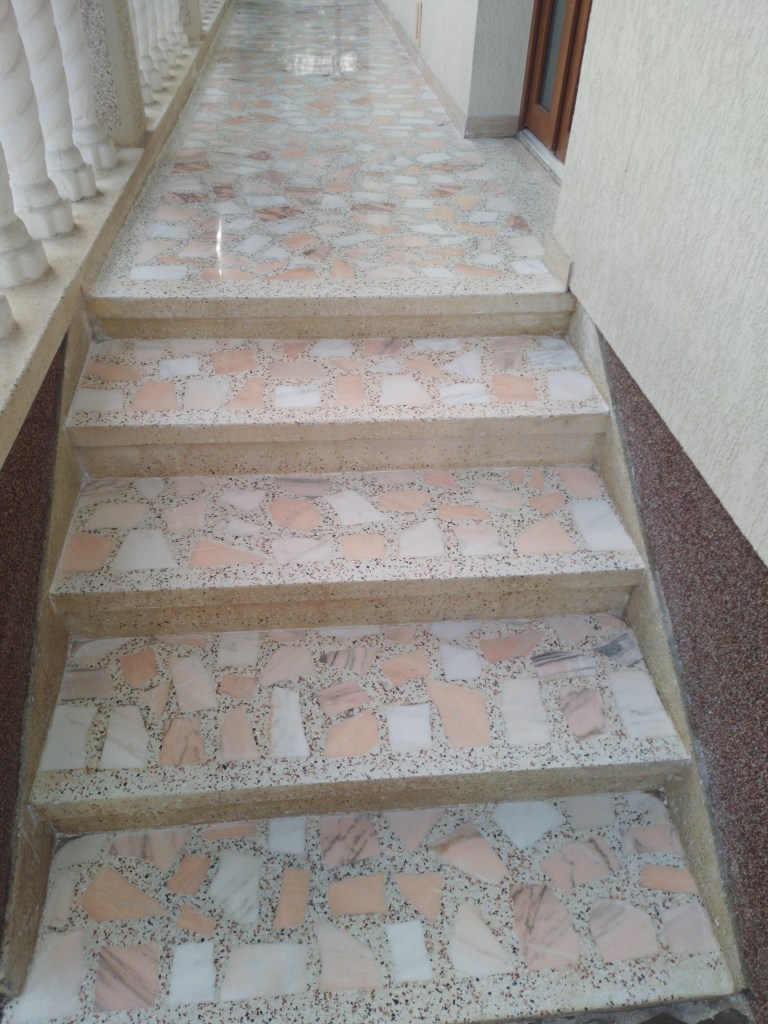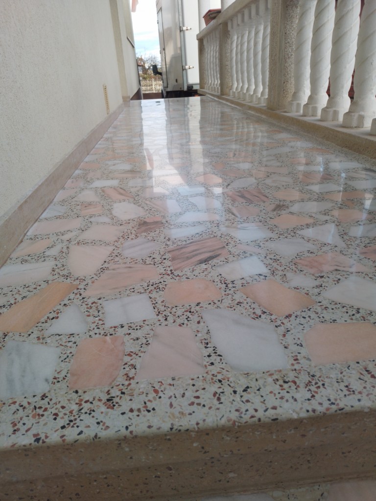 Reconditionare pardoseala frumoasa din mozaic venetian, terasa exterioara, turnat la inceputul anilor 90. Adus la standarde actuale, slefuit complet, chituit, lustruit clasic (finisaj rezistent fara guard, ceruri sau chimicale) si impregnant de calitate italian :