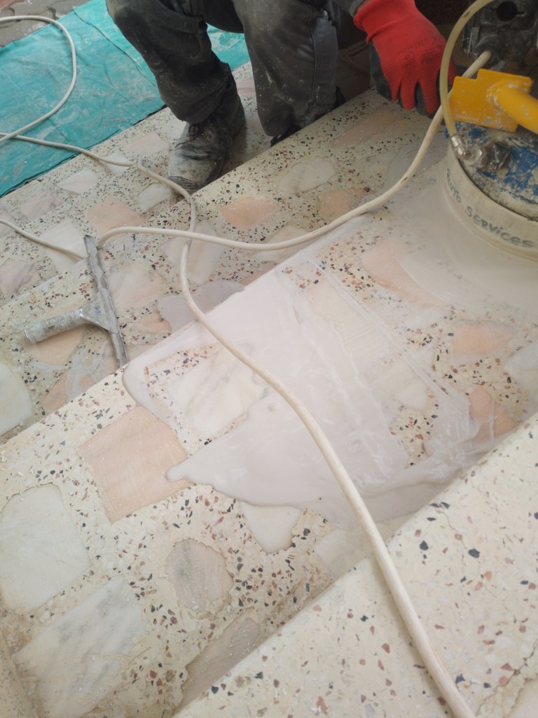 Reconditionare mozaic / terrazzo rosu din perioada interbelica :