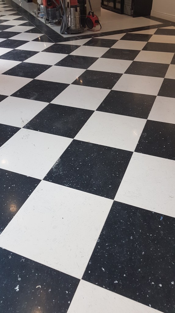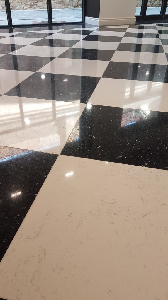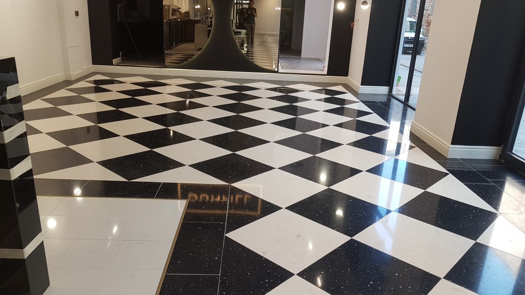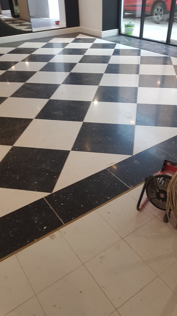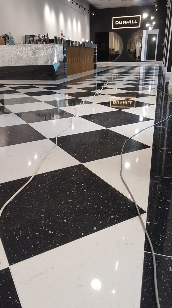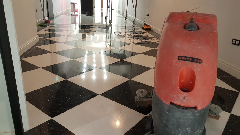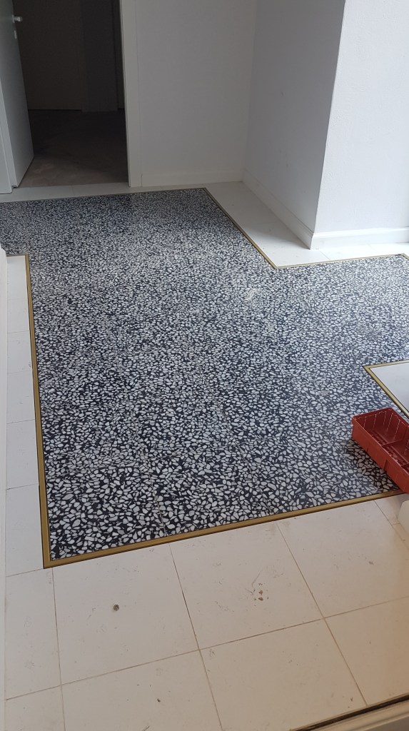 Slefuire terrazzo spaniol dupa montaj, pardoseala noua adusa din Spania. Terrazzo alb in spatiul de productie finisat mat satinat pentru intretinere usoara si terrazzo negru la intrare clienti cu finisaj lustruit :