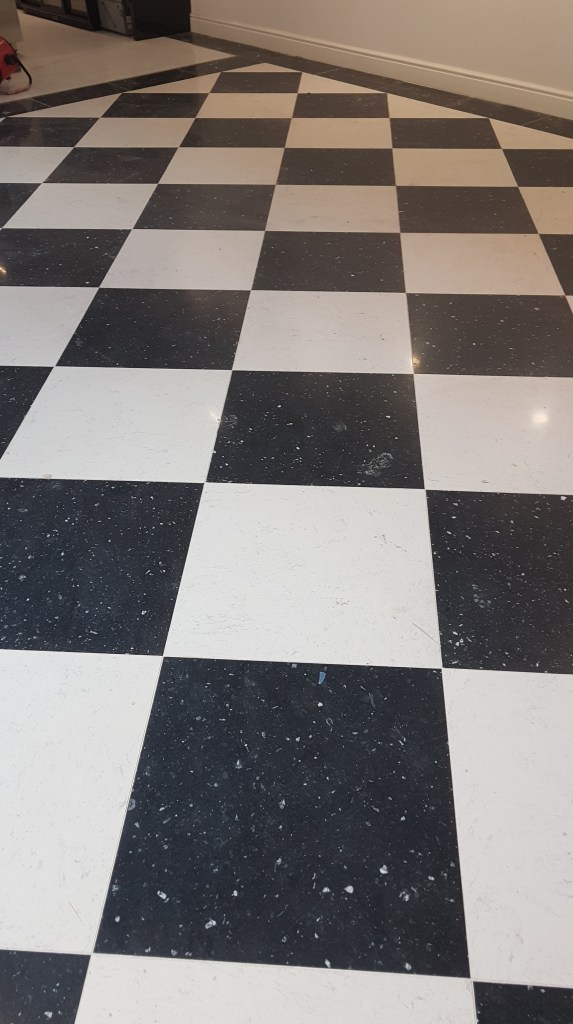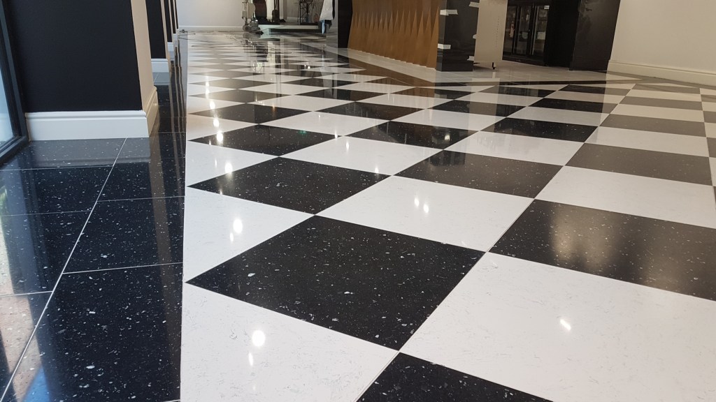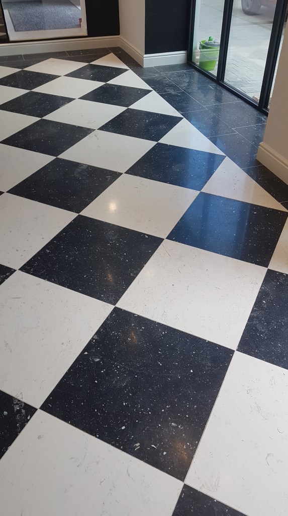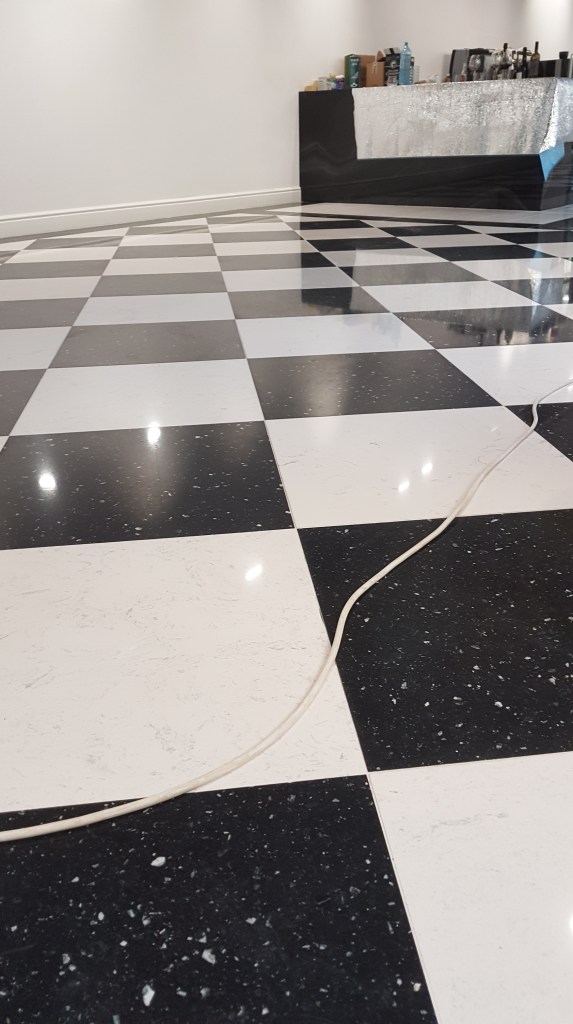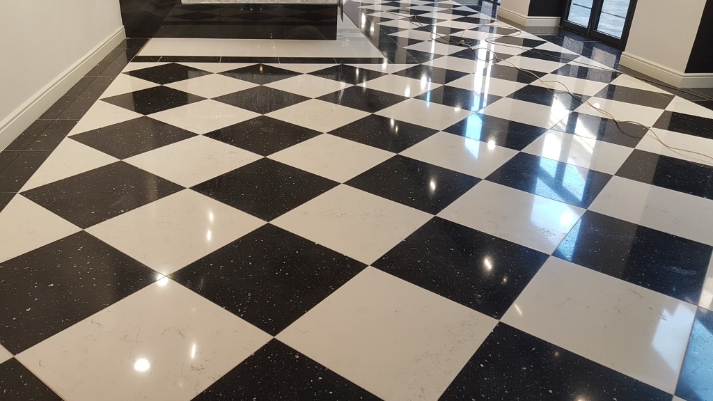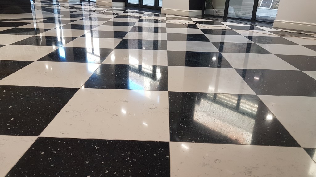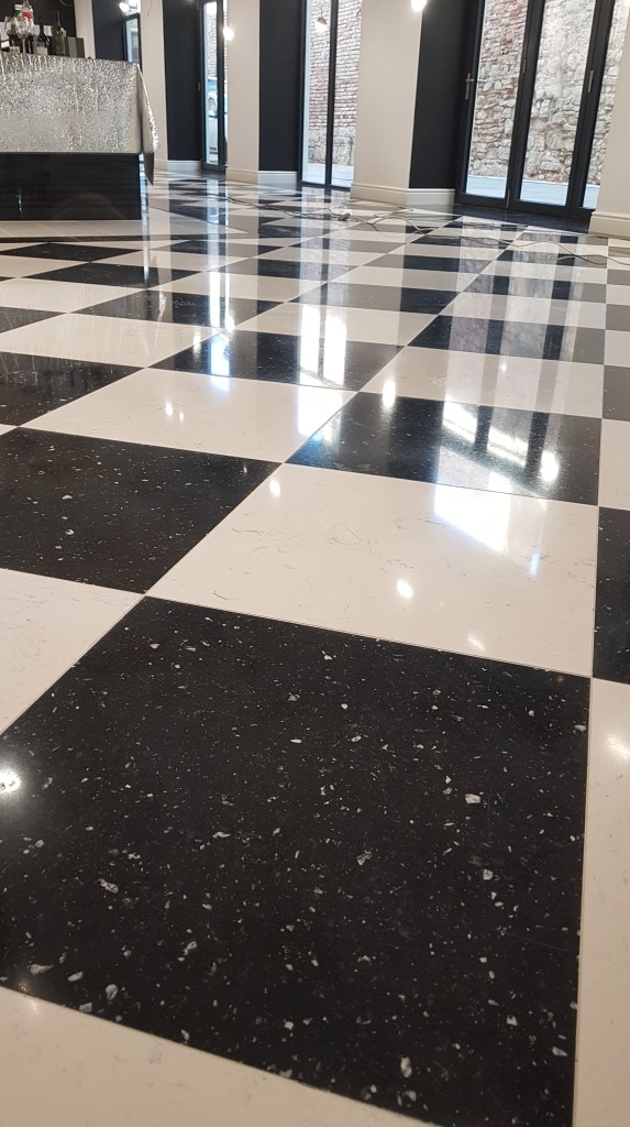 Slefuire terrazzo spaniol dupa montaj, pardoseala noua adusa din Spania. Terrazzo alb in spatiul de productie finisat mat satinat pentru intretinere usoara si terrazzo negru la intrare clienti cu finisaj lustruit :