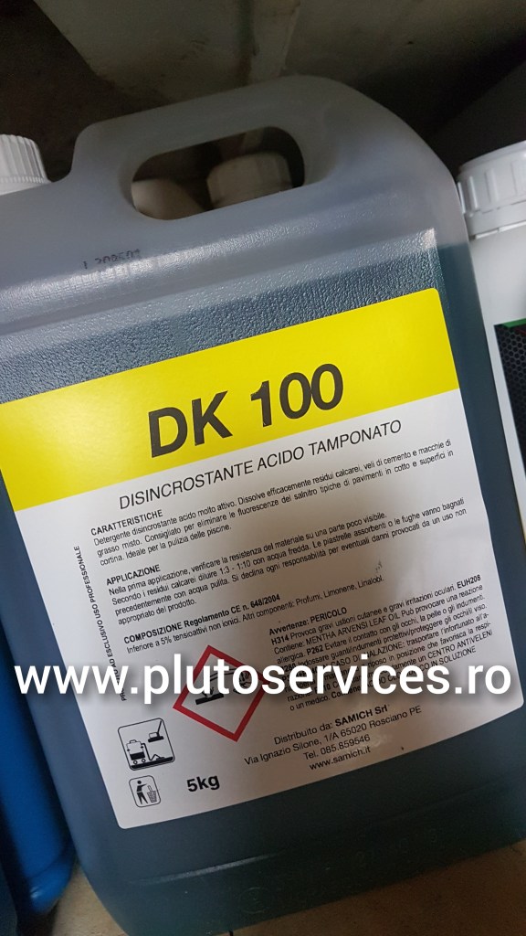 Detergent DK100, pentru curatare profesionala, produs acid. Se foloseste pentru eliminare nitrati, eflorescenta (albeata) beton, caramida, terracota, cotto, beton, mozaic, calcar, granit, basalt, orice piatra.