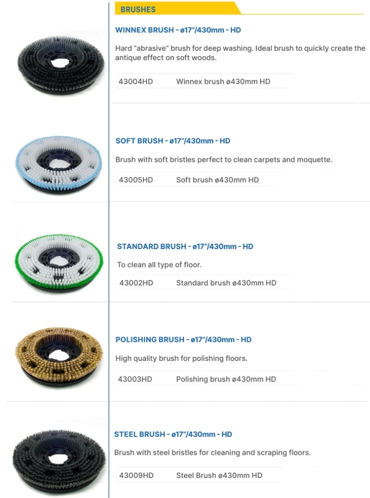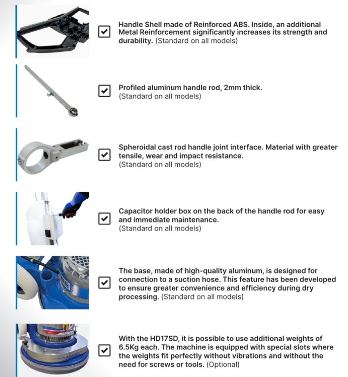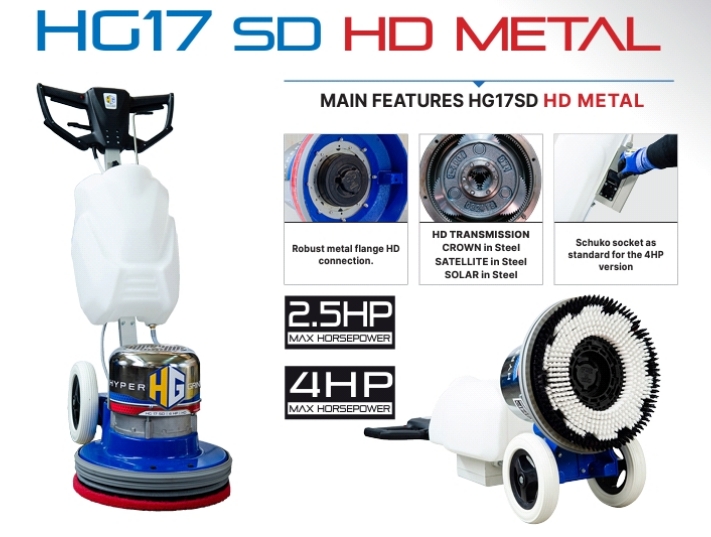HG17SD HD: Ideal for heavy duty applications. The METAL version with helical gear reducer is the ideal solution for daily cleaning, offering unprecedented simplicity and speed. This single-disc machine is extraordinarily versatile and maneuverable, perfectly adapting to every type of surface, from linoleum to porcelain stoneware, and including resin floors, porphyry, granite, and concrete. With the HG17SD METAL, there is no surface that cannot be worked on! Its excellent performance guarantees effective use and brilliant results on all surfaces.
