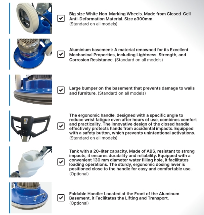 The new single-disc machines from HG Hyper Grinder are the result of a meticulous design process, subjected to rigorous testing and inspections to guarantee the highest quality. Every aspect has been thoughtfully considered to offer an extremely comfortable working experience, without neglecting reliability and long-term durability. These devices are designed to withstand wear and tear and provide excellent performance over time, making every cleaning operation a satisfying and lasting experience.